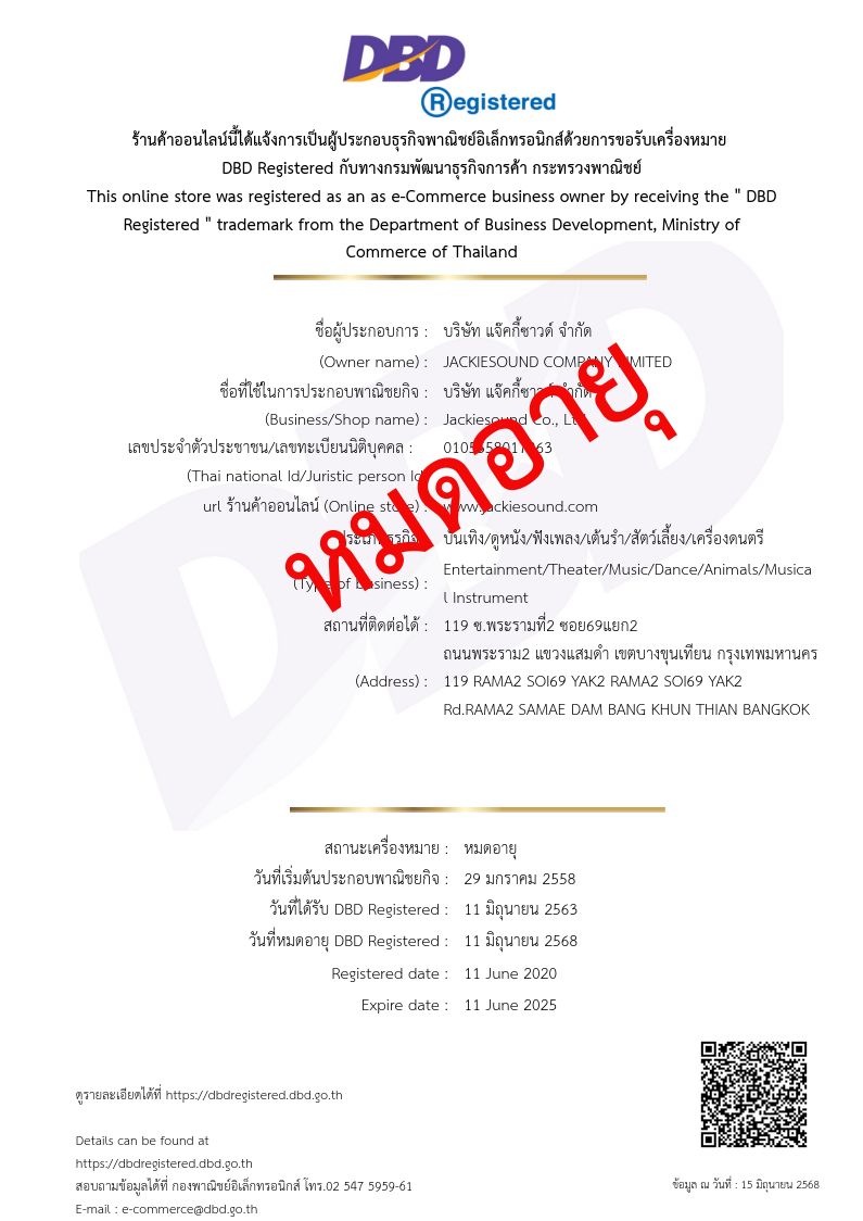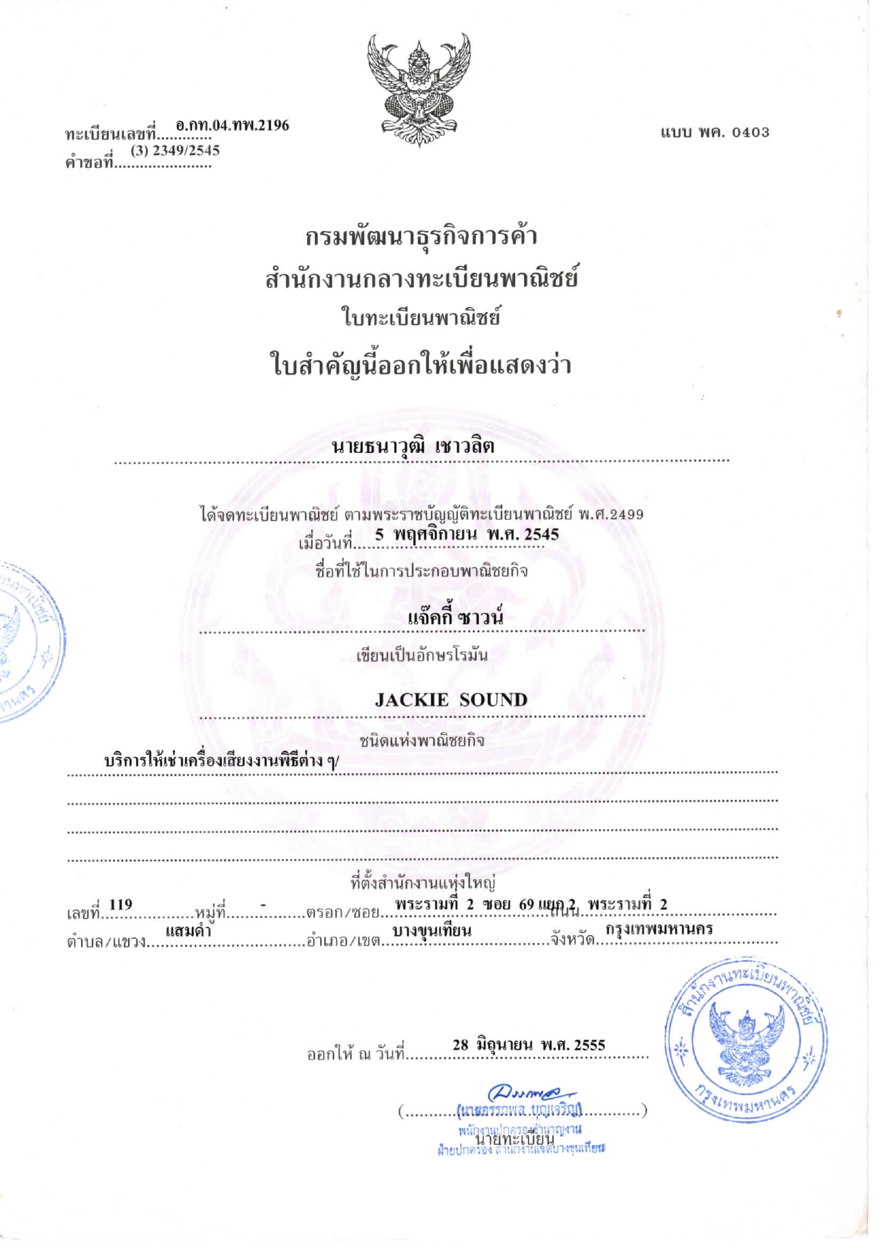 โดยจดทะเบียนในนามบุคคลชื่อ ร้าน แจ๊คกี้ซาวด์ และได้จดทะเบียนในนามนิติบุคคล