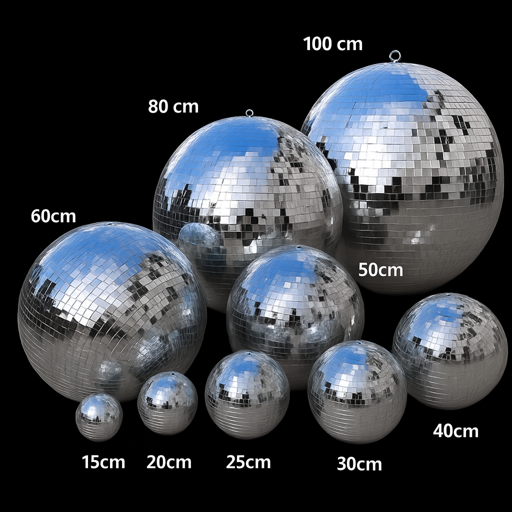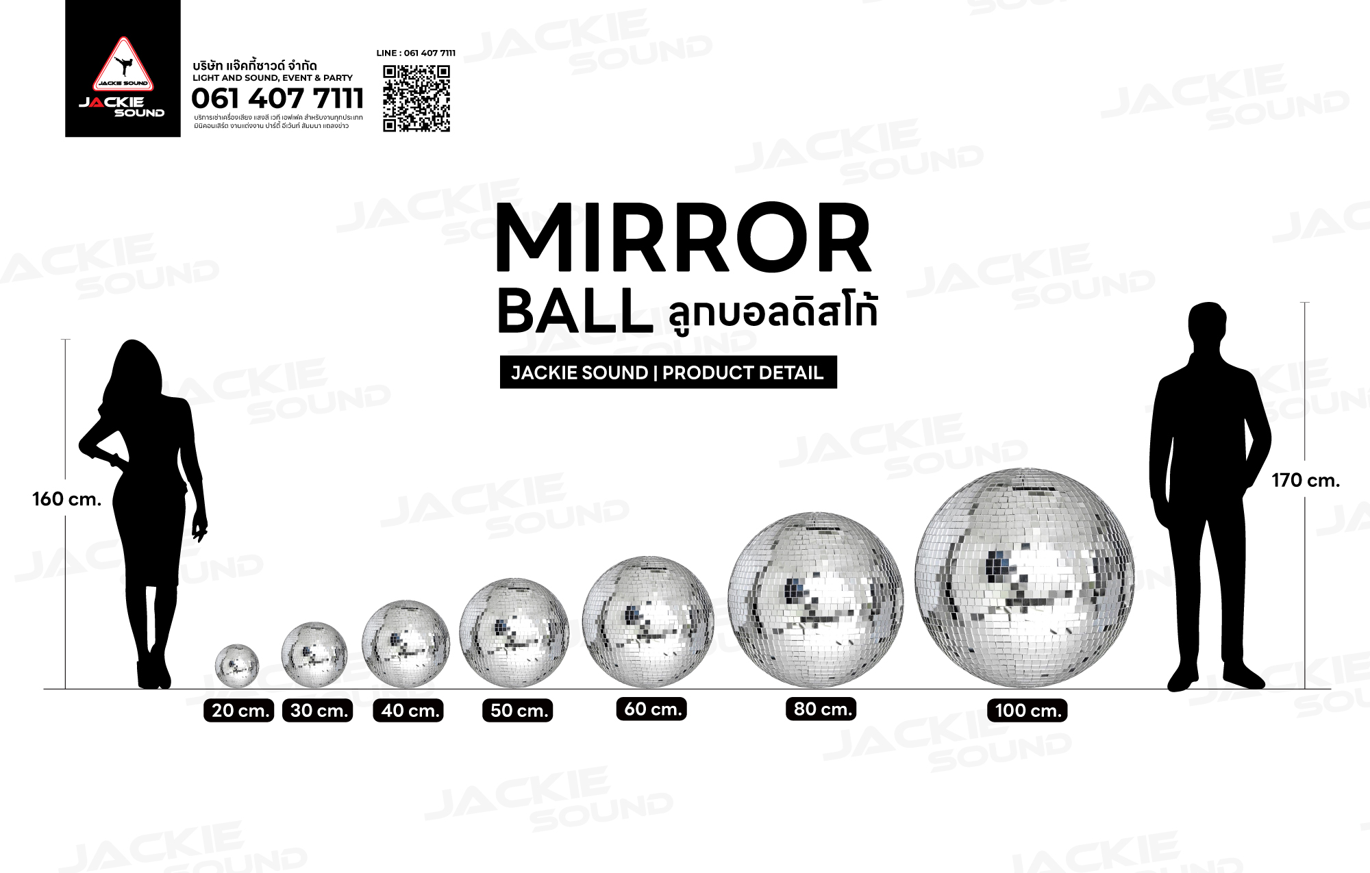 Mirror Ball มีหลากหลายขนาดให้เลือก โดยจะวัดเส้นผ่านศูนย์กลาง ดังนี้