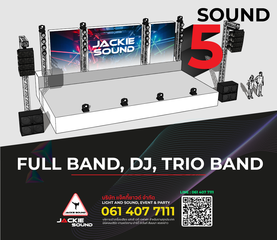 | SOUND 5 | FULL BAND, TRIO BAND | FOR 400 PROPLE INDOOR | ลดพิเศษเหลือ 18,000 ฿ **ราคานี้ไม่ครอบคลุมงาน ในวันปีใหม่** **แพ็กเกจนี้ไม่รวมเวทีและฉากหลัง** **ระยะเวลา การใช้งาน 8 ชม./คิว** (ราคาปกติ 20,000 ฿) | |