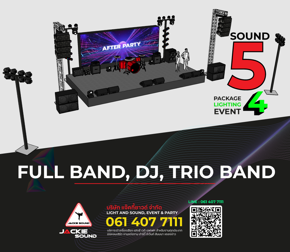 | SOUND 5 + Light 4 | FULL BAND, TRIO BAND | FOR 400 PROPLE INDOOR | ลดพิเศษเหลือ 18,000 ฿ **ราคานี้ไม่ครอบคลุมงาน ในวันปีใหม่** **แพ็กเกจนี้ไม่รวมเวทีและฉากหลัง** **ระยะเวลา การใช้งาน 8 ชม./คิว** (ราคาปกติ 20,000 ฿) | |